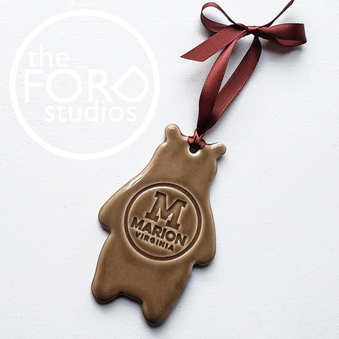These Ceramic Marion Ornaments from Jive pottery are hand-stamped, hand-cut and hand-dipped in glaze.  The handmade nature of these ornaments means there will likely be differences in size, color, ribbon selection, etc.  The current year's ornament image, posted here, is a mockup.  An image of the actual ornament will be added, when available.