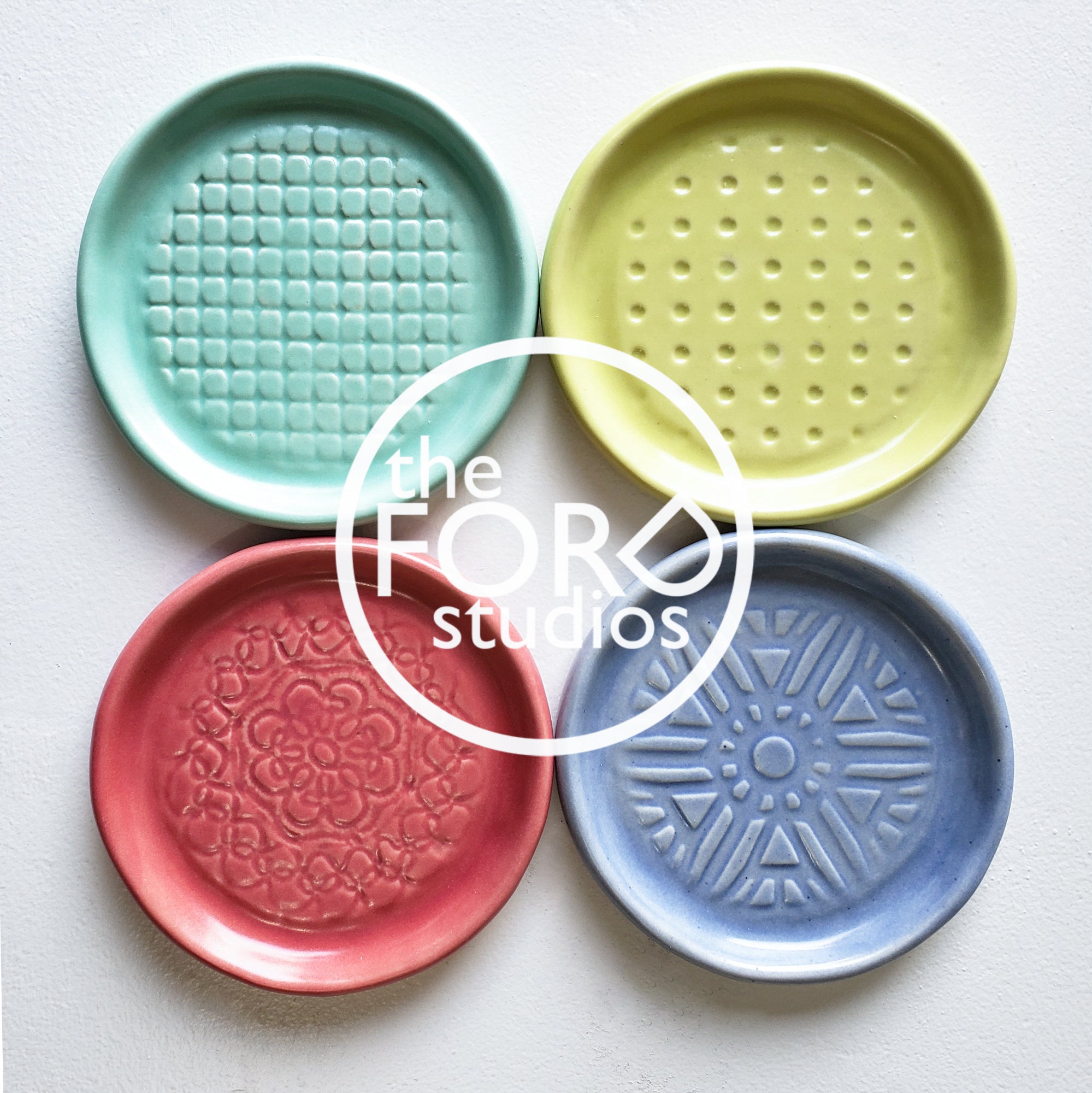 During this class, students make a set of 4 coasters. The class will begin with practicing texture techniques like embossing & stamping. You will then make a coaster, step-by-step, including a rimmed edge to prevent drips. (Image of finished piece coming soon.)